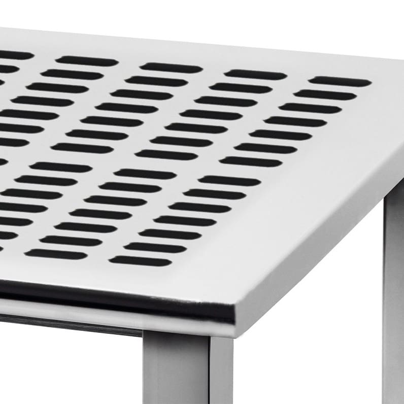 Furthermore, the Grade 304 Stainless Steel top is perforated with 1-inch by 3-inch slots and features a reinforced design with a square edge. Because of the electropolished finish, this bench meets ASTM B912 standards and is suitable for Cleanroom Class 1.
