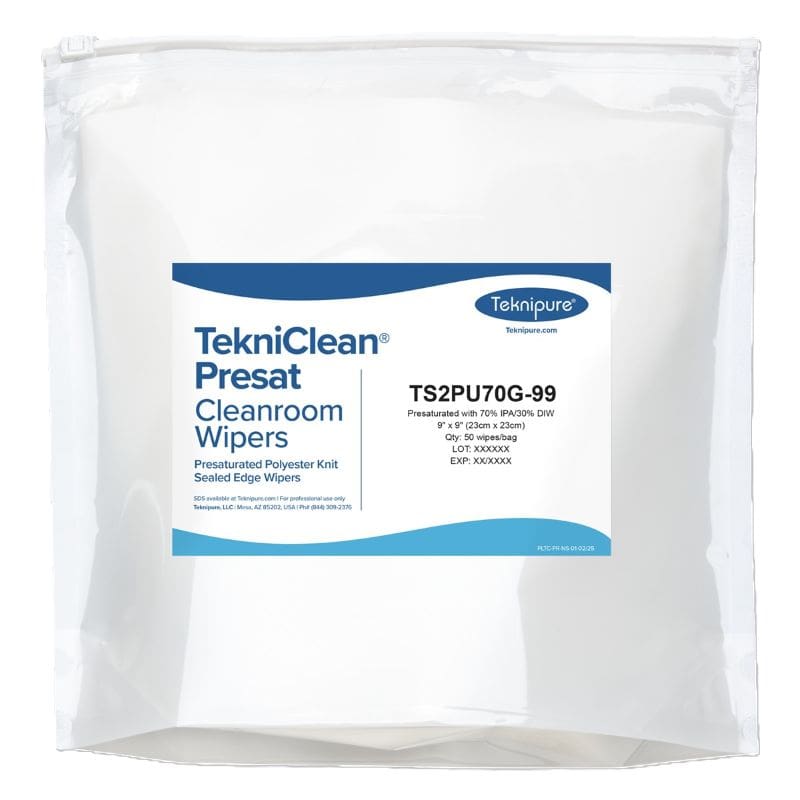 Teknipure TekniClean Polyester Sealed Edge Pre-Saturated Wipers 70%IPA Gusset Bag provide ultra-clean performance in critical environments. These wipers contain 70% isopropyl alcohol and 30% DI water. Specifically, the polyester knit material offers a low-linting and low-shedding solution. Furthermore, the design ensures highly effective wiping.